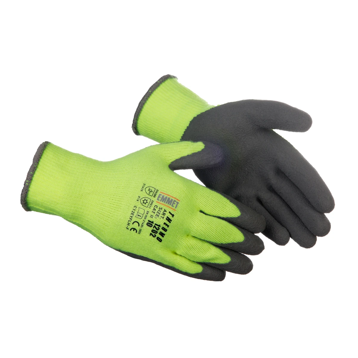 10G poliestera adīti ziemas cimdi ar akrila flīša siltinājumu; mīksts un elastīgs, vidēji raupjš, putota lateksa pretslīdes pārklājums; neona -dzeltena pamatne; piemēroti būvniecībai, ceļu darbiem, industriālam teritorijām, noliktavām; EMMET Izmēri: 8.- 11., Standarts:CE EN ISO 21420, EN 388 2141X EN 511 X1XAtlikums